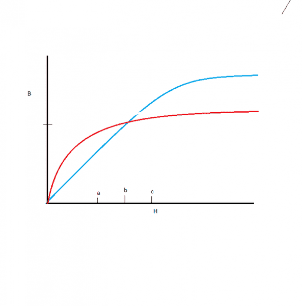 View attachment 105811 Here the blue curve is the iron and the red is some other material with higher μ but lower saturation. If you were originally operating at H=a, then changing materials would increase B, even though the material is now approaching saturation.