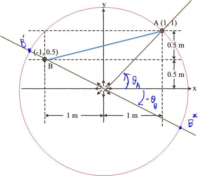 $$\theta_A=\tan^{-1}\left(\frac yx\right)=\tan^{-1}\left(\frac{\mathit1}{\mathit1}\right)=0.7854\;rad$$$$\theta_B=\tan^{-1}\left(\frac yx\right)=\tan^{-1}\left(\frac{0.5}{-1}\right)\;=\;-0.4636\;rad$$$$Q_{AB}=\psi\left(\theta_A\right)-\psi\left(\theta_B\right)=\frac q{2\pi}{(0.7854+0.4636)}=0.19878q........(Ans(2))$$