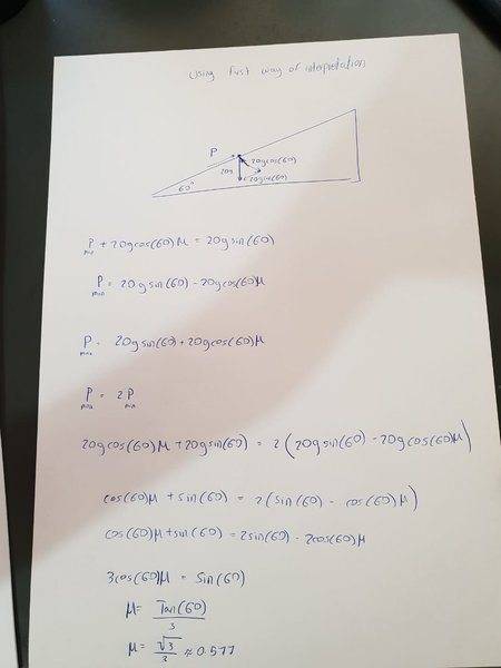 A block of mass 20kg is on rest on a rough plane inclined at 60 degrees to the horizontal. A force P is applied to the block to "maintain equilibrium". P is parallel to the line of greatest slope of the inclined plane. The maximum value of P is twice the minimum value of P. Find the coefficient of friction between the block and the plane.