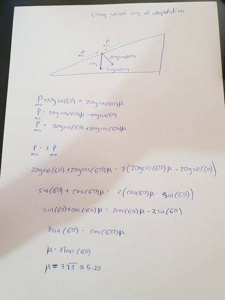 Attached are pictures illustrating the two methods. Can you please tell me which method do you think is correct? In my exam, I was leaning towards the second way but μ=5.20 seemed rather large. Moreover, the wording, "To maintain equilibrium" made it seem like the block would be sliding down without P hence it has to act up the line of greatest slope.