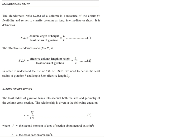 The specific problem I am having with this question is for b)i) how to determine what the mode of failure will be from the E.S.R. and the S.R. Admittedly this question has been asked many times and people seem to say it will buckle at the length determined in a). Now reading my course material, it states that if your E.S.R is below your S.R. then it will be a crushing mode of failure and above will be buckling. Now I have an E.S.R of 118.741 and a S.R. of 237.52. Am I correct in thinking that this will be a crushing mode of failure with the length of 5.938 m as we have just worked out that the minimum length at which buckling is likely to occur is 5.938 m, so how can this length be the minimum for bucking when the slenderness ratio is 237.52. I would like to make sense of this and I feel like I am chasing my own tail at the moment. Thank you very much for any assistance.