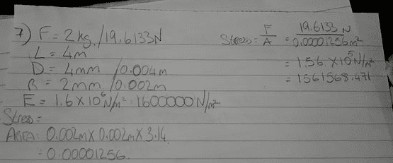 $$Stress = \frac{F}{A} = \frac{2kg * 9.8m/s^2}{\pi * (0.002m)^2} = \frac{19.6N}{12.56 * 10^{-6}m^2} = 1.56 * 10^6 N/m^2$$