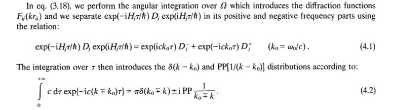 The discussion centers around the derivation and notation used in a report on collective spontaneous emission, specifically addressing the separation of operators in the Heisenberg representation and the meaning of the PP distribution. Participants explore the mathematical treatment of integrals involving complex variables and the implications of regularization techniques.
