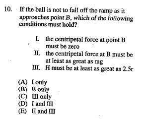 The discussion focuses on the application of energy conservation principles in the context of centripetal acceleration. The participant initially struggled with identifying the correct answer, which was confirmed as E, and sought guidance on the theoretical basis for this choice. They successfully eliminated options I and II but remained uncertain about option III, particularly regarding the relationship between speed at point B, height H, and centripetal force. The conversation emphasizes the importance of understanding mechanical energy conservation in solving centripetal acceleration problems.