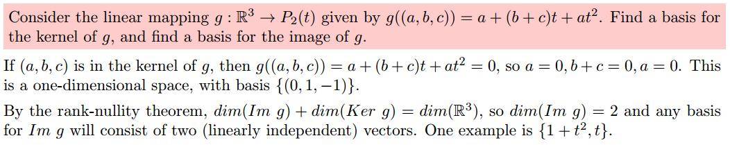 If the vector $(a,b,c)$ satisfies $a=0$ and $b+c=0$, then $c=-b$ and the vector is equal to $(0,b,-b) = b(0,1,-1).$ So all such vectors are scalar multiples of $(0,1,-1)$. Thus the single vector $(0,1,-1)$ forms a basis for the kernel of $g$, which therefore has dimension 1.