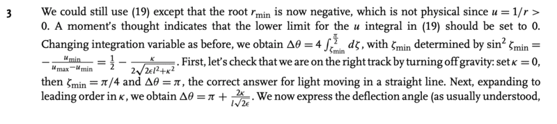 The question asks to consider light as corpuscles and calculate the deflection of light by the sun. I was confused even where to start, so I peeked at the solutions and saw that Zee mentions applying equation (19) with r_min < 0. I’m confused on why that’s the case. He later says that we can consider u_min = 1/r_max as being 0, which I think I understand (light’s the only thing fast enough to escape the gravitational pull into infinity?), but I was confused by that statement of his. Can anyone explain why r_min would be < 0? Mathematically, of course, since he himself mentions physically it doesn’t make sense.