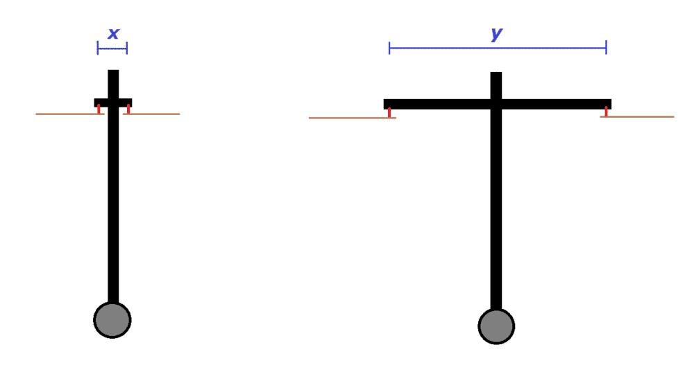 In the below picture, there are two version of a pendulum with a weight at the bottom. It moves in and out of the screen, around an axis resting on two nails (red). My question is, how does the distance (x and y) of the axis affect the motion, if we neglect the weight of the horisontal bar? Will the x-version move for a longer period of time, if the pendulum is released from the same position as the other version? Or is there no difference?