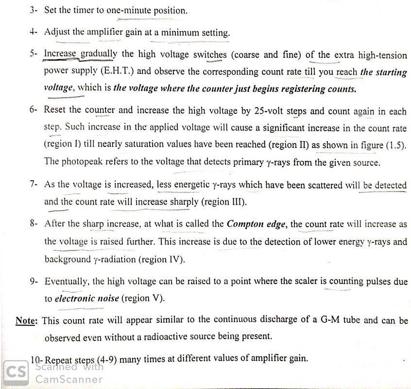 1 - i need some one to verify my interpretation of the working principle : the sodium iodide crystal emits photons of visible light the intensity of these photons is related to the energy of gamma radiation → these photos is turned into an electrical signal with a certain pulse height by the Photo Multiplier tube → by using a single channel analyzer with a specific window width we are able to count exactly the number of pulses within an interval ##ΔV## apart , a histogram of the number of pulses with their height is plotted indicating the different peaks .