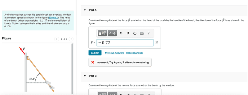 - A window washer pushes his scrub brush up a vertical window at constant speed as shown in the figure (Figure 1). The head of the brush (when wet) weighs 12.0 N and the coefficient of kinetic friction between the bristles and the window surface is 0.100.