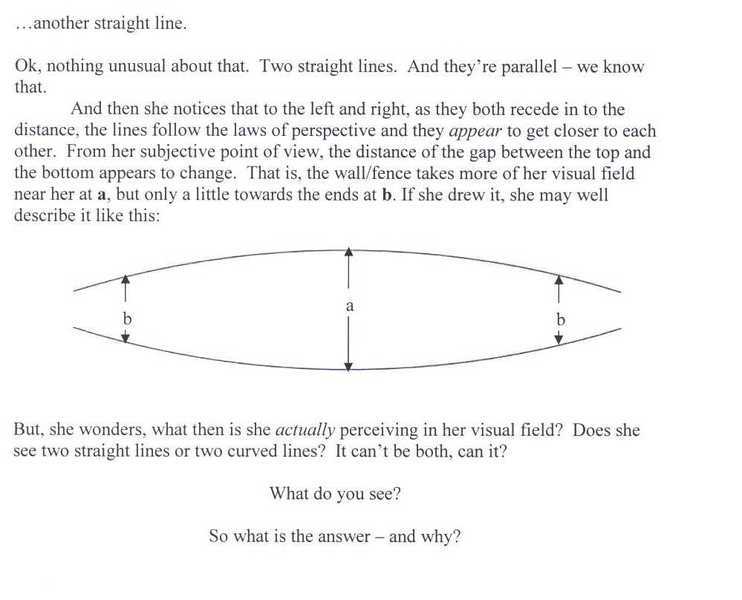 However, if it is true that every straight line you see is not seen as curved, but as a straight line, why do we also have the argument that we see parallel lines as curved in relation to each other?