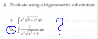 The discussion revolves around a trigonometric substitution problem related to the integral $$\int\frac{1}{x^2\sqrt{x^2+4}}\,dx$$. Participants explore various substitution methods, specifically using $$x=2\tan(\theta)$$, and discuss the subsequent steps in solving the integral, including expressing the result in terms of the original variable x.