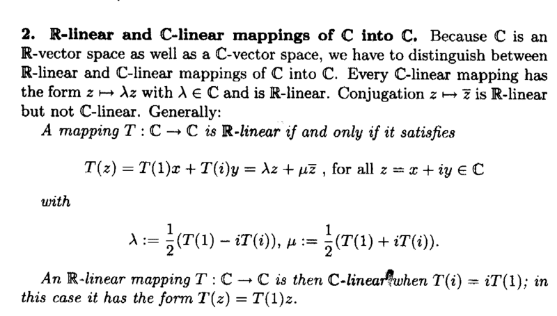 Remmert's section on ##\mathbb{R}##-linear and ##\mathbb{C}##-linear mappings of ##\mathbb{C}## into ##\mathbb{C}## reads as follows:
