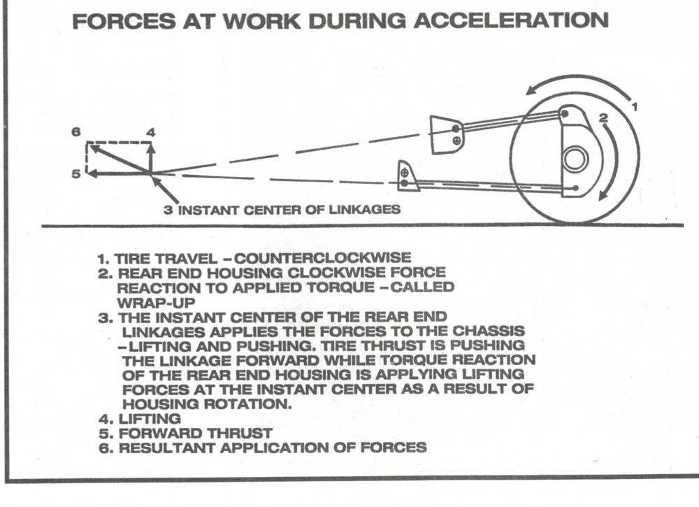 Look at the Instant center angle. I do not have the hard numbers but it sure looks like the intersection of the two J bars and the pull bar is way out in front of the axle. Like 10 foot in front of the car! We want the angles of the rear suspension linkage to form an Instant Center (IC) as far forward as possible. This longer lever cushions the acceleration when the tires hook up. This set up does not have a shock damper on the top link. Too short an IC distance means we have a lot of angle change on both sides and the car will be real darty when you nail it. Longer is better and gives the driver more control because you don't have a lot of angle change as the shorter IC has. The top link angle can be zero to 5 degrees down hill for traction.See attached forces on rear axle -
