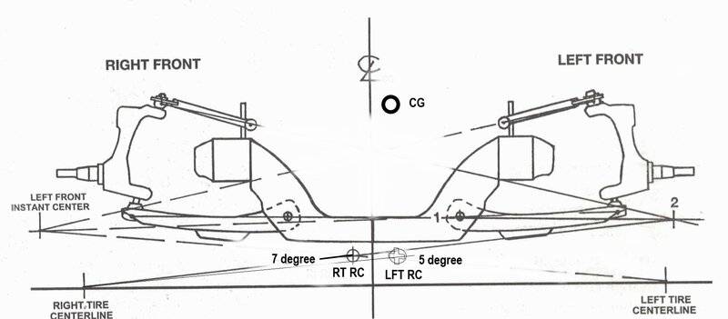 Left RC has a 4° angle to the right front tire contact patch. The Right side RC has a 6° angle. This is the jacking effect that can lift the left side tire if it is great enough. Remember the sprint cars carrying the left front tire off the ground thru the turns. This happens when the roll center is placed too far to the right of centerline.