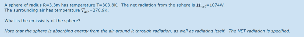 Now as I was writing this I figured out how to do it by trial and error but am a bit confused. So apparently the surrounding air is decreasing the net radiation? Is that because its of a lower temperature? So if the air was hotter would I add it instead of subtracting it? Below is the equation I used to solve.
