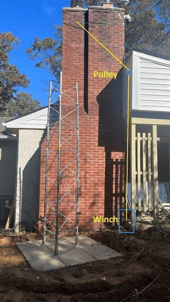 - Chris describes the setup of a 40' aluminum tower, detailing the weight distribution and the mounting of the winch and pulley.