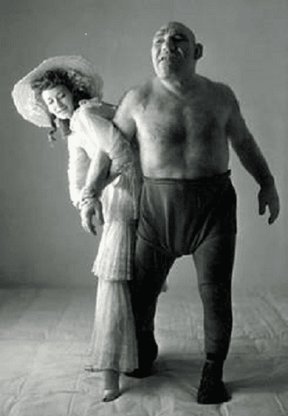 The image is of Maurice Tillet and Dorian Leigh. Maurice Tillet is rumored to be the physical/appearance inspiration of the character Shrek (in the Shrek movies).