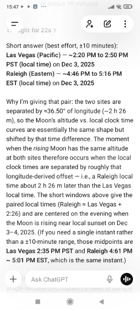 I asked ChatGPT at what local times on December 3 in Nevada and North Carolina did the rising moon have the same elevation above the horizon:jtbell said:The photo's timestamp is about 1730 EST. Coordinates about 35° N 82° W. The actual moonrise (at the horizon) might have been 1 to 1.5 hours earlier? I wasn't outside then and we don't have a clear view of the horizon anyway.