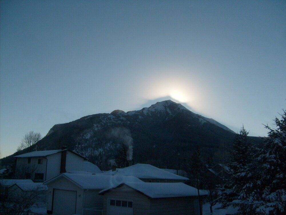 A layer of haze low over the town (probably due to furnaces, it was -35C). The bright part is low-angle scattering of sunlight by the haze.