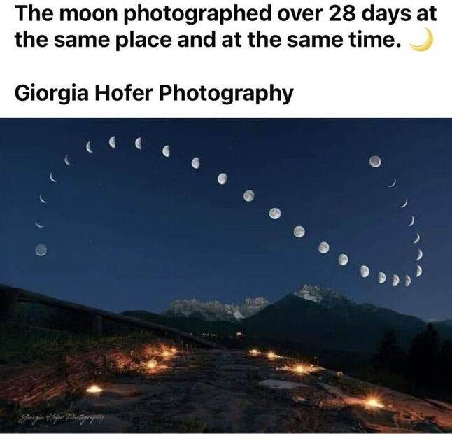 The caption can't be right though, in that it's not possible to take that picture at the "same time" each day, even if it is the same location and camera orientation/setup. A photo of a thin crescent can be taken at some particular time of day, but wait 2 weeks for a full moon, and it will be in roughly the opposite side of the sky (roughly 180 deg difference) at that particular time of day. And you can tell by the foreground that the image is not a >180 deg panorama.