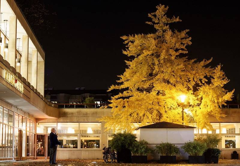 Yellow autumn tree with a man in the evening: