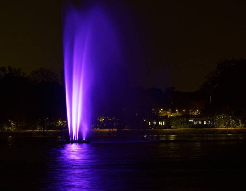 Pond fountain with purple lights (exposure: 1 s):
