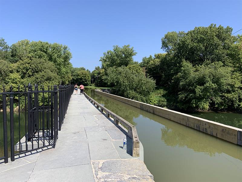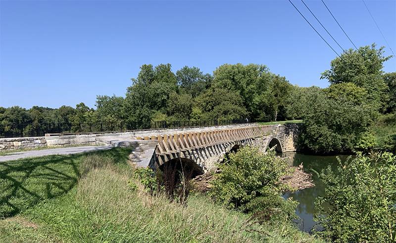 An aqueduct carries the canal across Conococheague Creek which flows into the Potomac River a short distance downstream to the left.