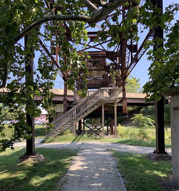 The steel bridge in front of the highway bridge is a former railroad lift-bridge. It's permanently fixed in its raised position, and serves as a pedestrian bridge.
