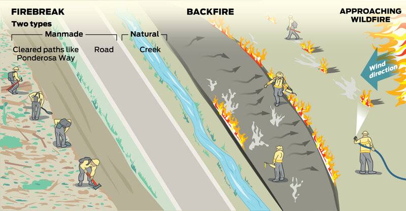 I've watched a fire spread by embers blowing ahead of the fire. A fire break might have to be one or two or three miles (3.2 to 5 km). To keep the dust down, one would have to plant succulents, which might work in S California, but would be problematic in parts of Oregon, Washington, and up in Canada, where winters get very cold.