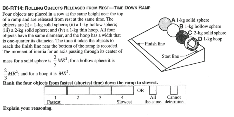 Rank the four objects (1kg solid sphere, 1kg hollow sphere, 2kg solid sphere and 1kg hoop) from fastest down the ramp to slowest. (Please see the attached screenshot for more details.)