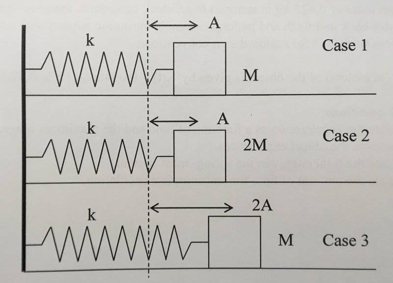 Case 2 has mass 2M and amplitude A