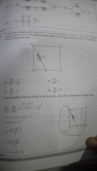 In a given square ABCD each side is of 1 m and resistance of wire is 1 ohm/m. A resistance of 1 m is connected from A to E (which lies on side CD). A constant potential difference is applied across A and C, if potentials of B and E are same then find CE/ED.