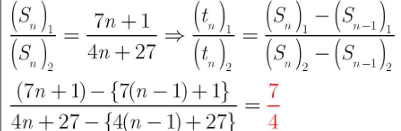 - The ratio of the sum of ##n## of two APs is ##\dfrac{(7n+1)}{(4n+27)}##. Find the ratio of their ##11^{\text{th}}## terms.