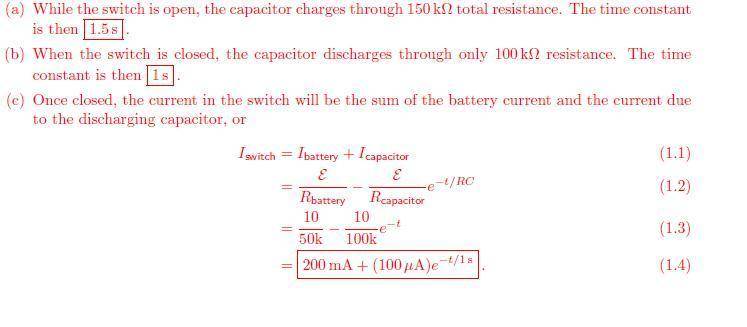 ok my question is about the solution for the question "c", it says that the current is the sum of the current produced by the battery and the current produced by the dischargin process,well ,my teacher told me that after that a capacitor is fully charged by a battery , the current is zero because there is no pottential difference between them. so, :