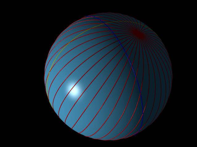 The blue line is the day/night terminator and the yellow line an orbit the "comes out of the Sun" relative to the North pole (where the blue and yellow lines cross)