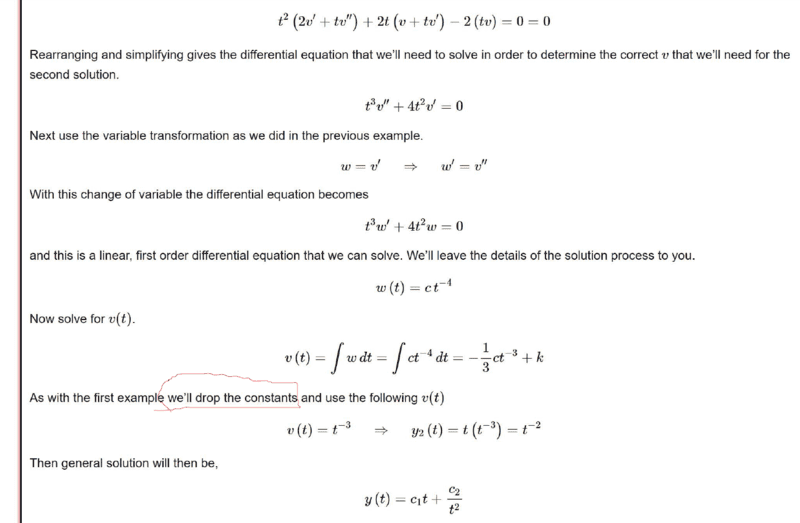 The discussion centers on the reduction of order technique in solving second-order differential equations, specifically addressing the treatment of constants in the general solution. Participants clarify that the constant \( c \) is not dropped but rather assigned a specific value, such as \( c = -3 \). The constant \( k \) is similarly treated as a redefinition of the arbitrary constant \( c_1 \). Ultimately, maintaining two arbitrary constants in the solution confirms that a general solution has been achieved.