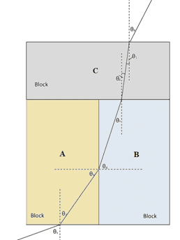 2. Draw another diagram where the angle of incidence of θ1 = 68°. Calculate all of the angles up to and including the point where it leaves the blocks.