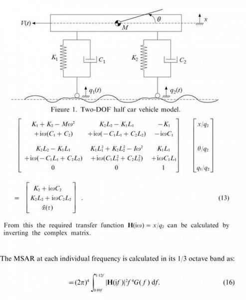 Working in the frequency domain, I have calculated the input-output relationship as a ratio (i.e. ground to body, x/q2 in the attachment) and the mean square acceleration response based on an input modeled using an exponential power spectral density.