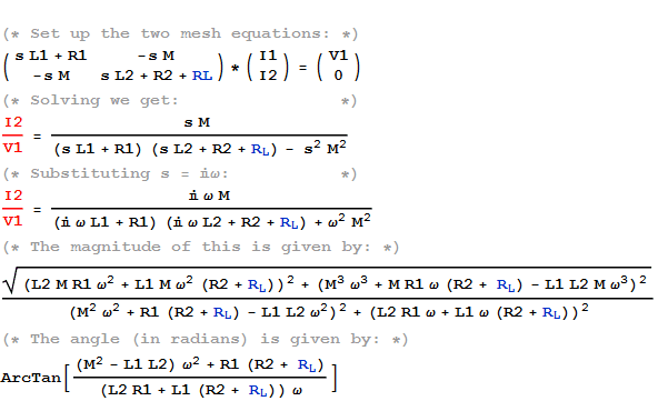 [tex]i_2=\frac{N_2N_1v_{1max}\omega }{\mathcal{R}\sqrt{R^2_1+{\omega }^2L^2_1}\sqrt{{\left(R_2+R_L\right)}^2+{\omega }^2L^2_2}}{\mathrm{sin} \left\{\omega t+{\mathrm{arctan} \left[\frac{R_1\left(R_2+R_L\right)-{\omega }^2L_1L_2}{R_1\omega L_2+\left(R_2+R_L\right)\omega L_1}\right]\ }\right\}\ }\[/tex]