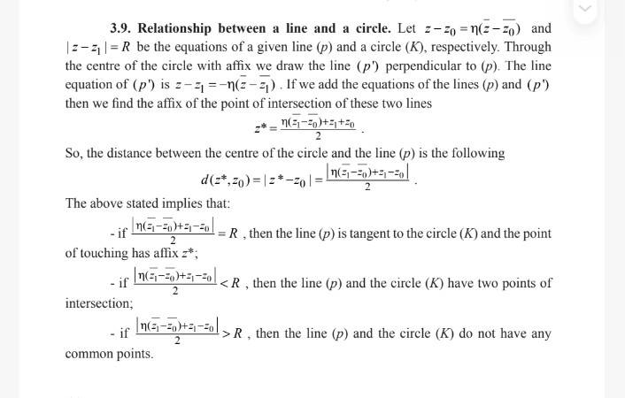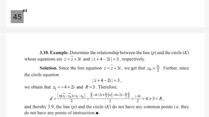 The discussion revolves around the relationship between a circle and a line in the complex plane, specifically addressing potential errors in a textbook regarding the calculation of distances between the center of a circle and a line. Participants explore the implications of these errors and seek clarification on definitions and concepts related to complex numbers.