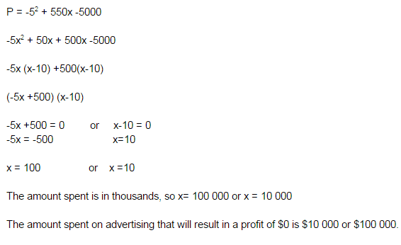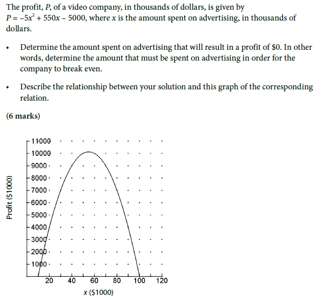 The corresponding graph shows the profit when different amounts are spent. The x-intercepts show the amount spent when the profit is $0.