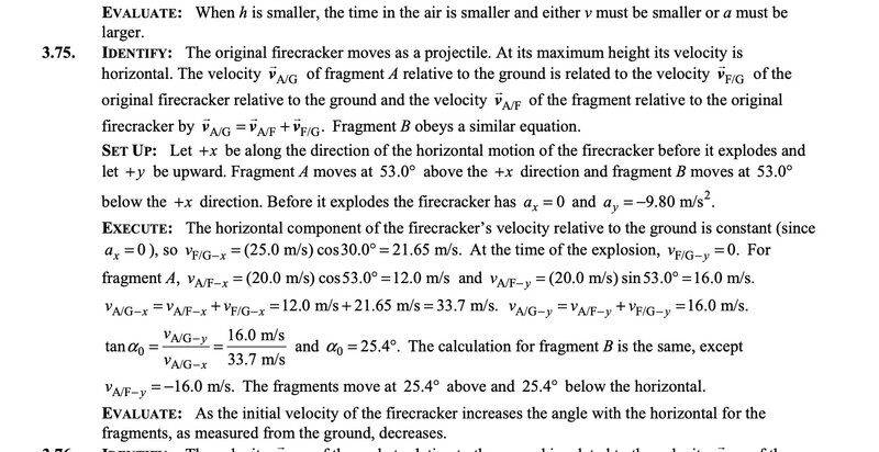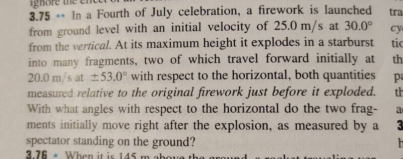 - In a Fourth of July celebration, a firework is launched from ground level with an initial velocity of 25.0 m/s at 30.0° from the vertical. At its maximum height it explodes in a starburst into many fragments, two of which travel forward initially at 20.0 m/s at ±53.0° with respect to the horizontal, both quantities measured relative to the original firework just before it exploded. With what angles with respect to the horizontal do the two fragments initially move right after the explosion, as measured by a spectator standing on the ground?