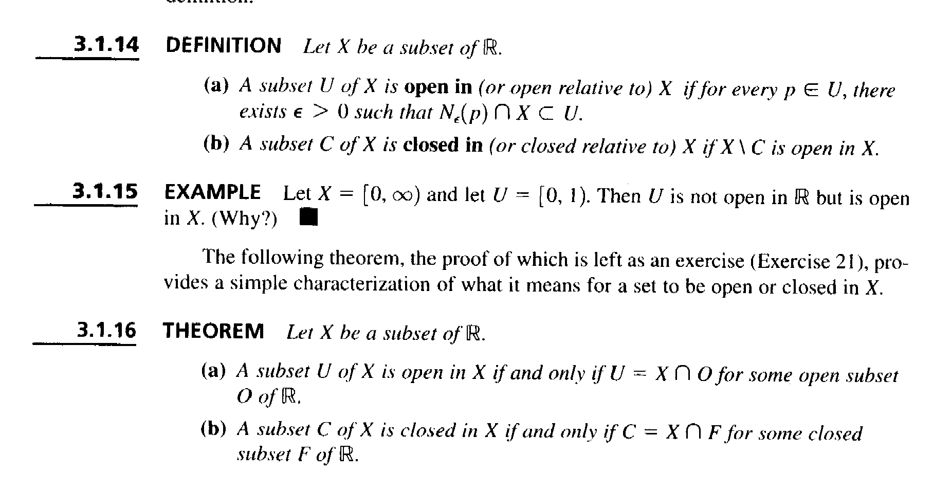 Suppose $$U = X \cap O$$ for some open subset $$O$$ of $$\mathbb{R}$$ ...Need to show $$U$$ is open in $$X$$ ... that is for every $$p \in U$$ there exists $$\epsilon \gt 0$$ such that $$N_{ \epsilon } (p) \cap X \subset U$$ ... ... Now ... let $$p \in U$$ ...