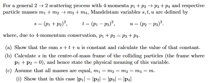 - Participants are questioning the necessity of assuming the CoM frame for the validity of the equation in part (c). There are discussions about the meaning of absolute values in the context of 4-vectors versus 3-vectors, and whether the problem's assumptions are clearly stated. Some express uncertainty about whether the problem can be solved without the CoM frame assumption.