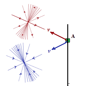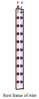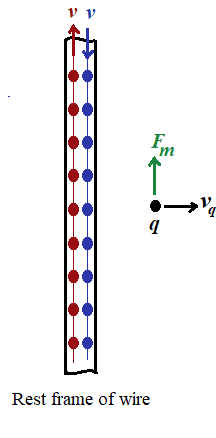 electric field. We want to see how this happens. In the rest frame of ##q##, the wire moves toward the left. So, the positive charges in the wire move upward and to the left. The negative charges in the wire move downward and to left. This is shown in the figure below. In the small region of the wire marked ##A##, the red arrow indicates the velocity of the positive charge carriers, the blue arrow denotes the velocity of the negative carriers.