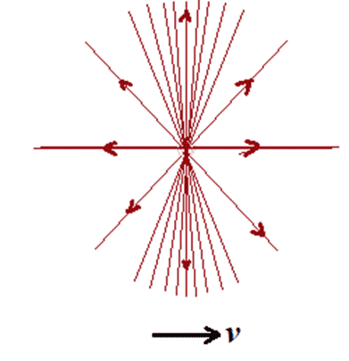 A uniformly moving point charge has a radial field that is stronger in directions perpendicular to the velocity direction. This relativistic effect is very small for non-relativistic speeds, but it's important here (I think).
