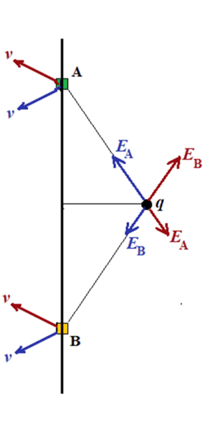 Finally, consider the diagram below which shows symmetrically placed regions ##A## and ##B## of the wire. The electric fields produced by the carriers in ##A## and ##B## at the location of the charge ##q## are shown.