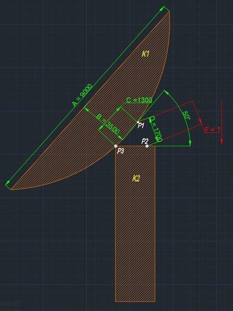Can somebody help me to solve this problem and guide? I need to calculate minimum force (F) (Newtons or kilograms) is required to pull down object (K1) to (K2), or to hold it in position. Angle between (K1) and (K2) = 50 degrees. Using mounting points (P1) and (P2). (K1) mass = 3.5 ton, (A) Length = 9 meters, (B) Height = 3.5 meters. Mounting points (P1) and (P3 is on a hinge) distance from center = 75centimeters, (C) = 1.3 meters in total. Height from point (P1) to (P2) is 1.7 meters.