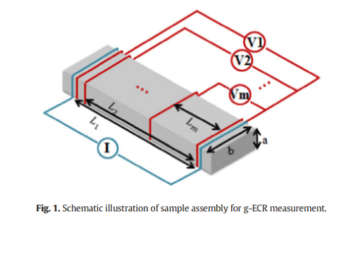 From the voltage measured, I'd like to calculate specific resistance. Resistance is calculated from the Ohm's law (current is kept constant). To calculate specific resistance, sample geometry is required. From what I learned, the relationship between the two is given by: $$R = \rho \frac {l}{A}$$