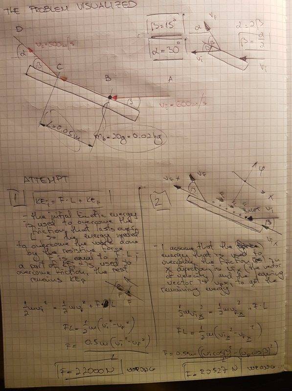 I tried getting to the solution by the principle of conservation of energy. What goes in, must go out. If the final velocity, ie. the final kinetic energy is lower than what we started with, that energy difference must've been used to overcome the friction that lasted over some distance L, meaning that the energy spent to overcome the friction is equal to the work done by the friction force F over the distance L. My way of thinking is now that KE(i)-KE(f)=F*L. It turns out I'm wrong and I don't really know how else I can attempt to arrive at the correct solution, which is magnitudes above what I keep getting.